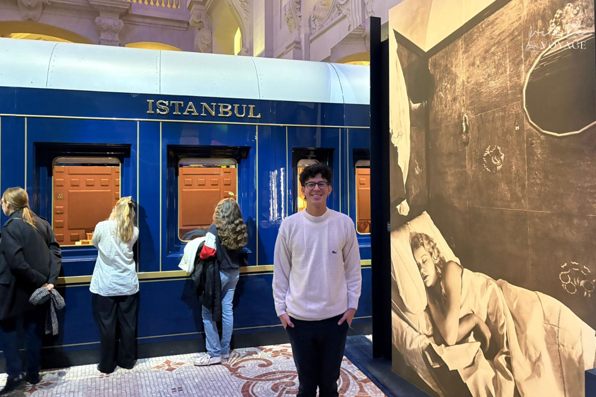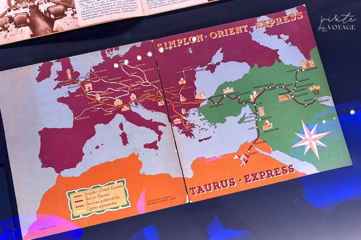 Outra peça linda da exposição é o mapa do trajeto histórico do Orient Express pela Europa. Ele mostra as rotas conectando Paris, Viena, Budapeste, Bucareste e Istambul — atravessando fronteiras, culturas e paisagens. O mapa reforça algo muito forte: esse trem sempre foi sobre conexão. Conexão entre países, histórias, pessoas e mundos diferentes. E isso me fez pensar muito sobre o turismo que eu quero fazer e promover com a Visite Voyage.