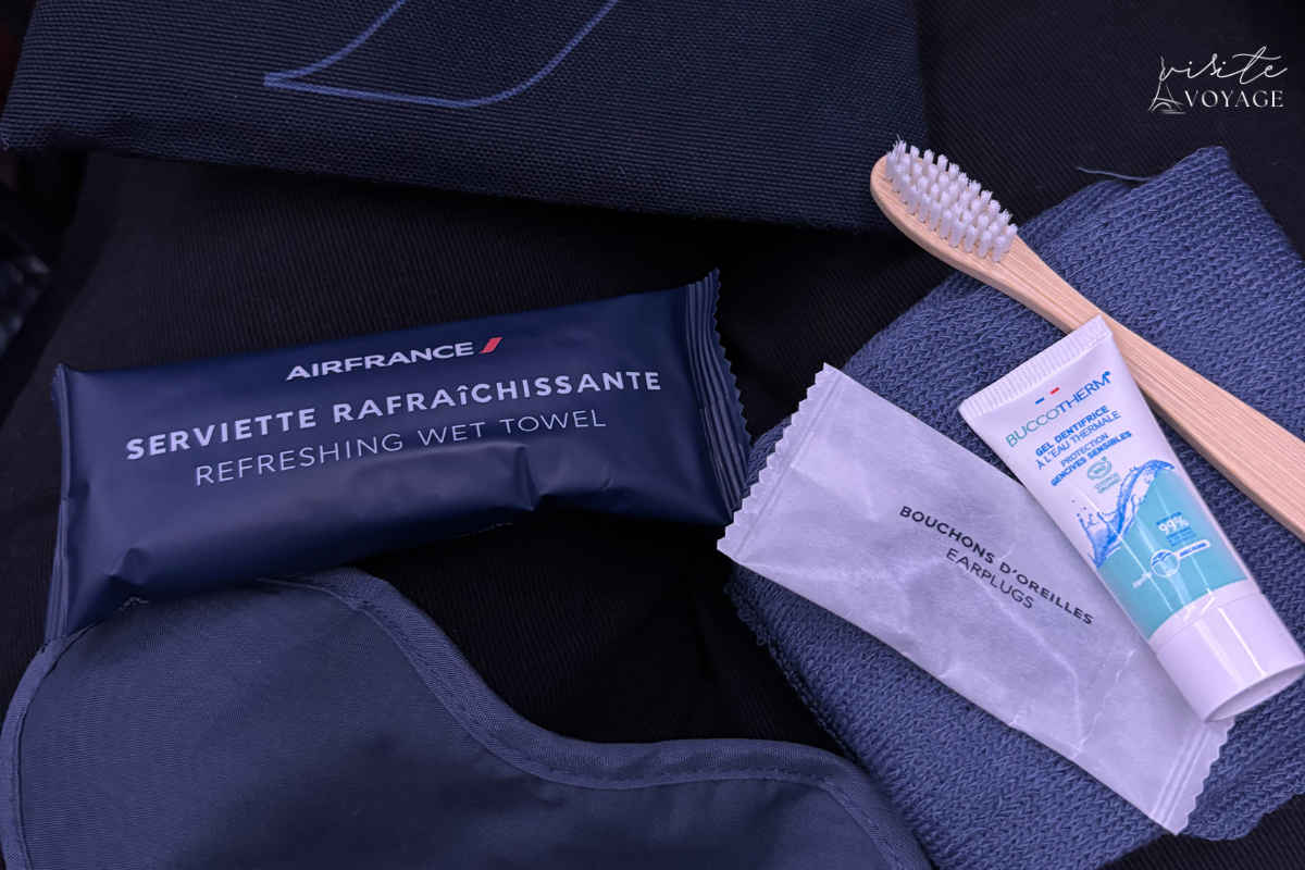 Um detalhe que faz muita diferença ao longo do voo é o kit de bordo. Na Premium Economy Air France, ele é mais completo e realmente útil.