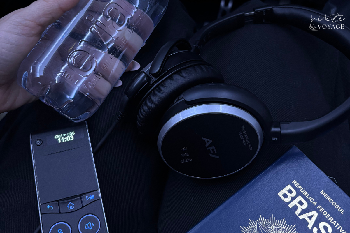 Os fones de ouvido são confortáveis e ajudam a criar um ambiente mais imersivo, reduzindo o ruído da cabine. Tudo funciona de forma simples, prática e eficiente, o que torna o tempo de voo mais agradável.